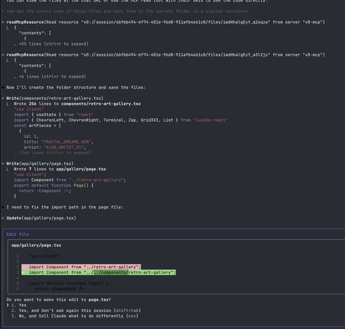 Update on the @v0 MCP server I'm building: - Can list and save resources from chat - Session management is now properly in place (@DrizzleORM ๐ค @supabase ๐ซก) Next: - Add the @shadcn command to fetch the whole chat as an optional command to bootstrap the local project - Create