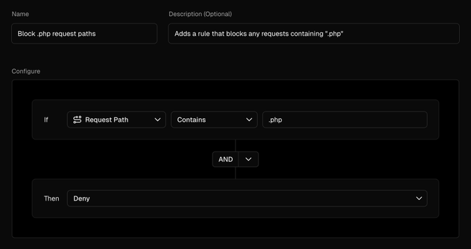 Blocked all bots looking for php vulnerabilities with this custom rule in Vercel Firewall. Firewall โ Configure โ + New Rule Name: Block .php request paths If "Request Path" - "Contains" - ".php" AND Then "Deny" Save Rule โ Review Changes โ Publish Enjoy ๐