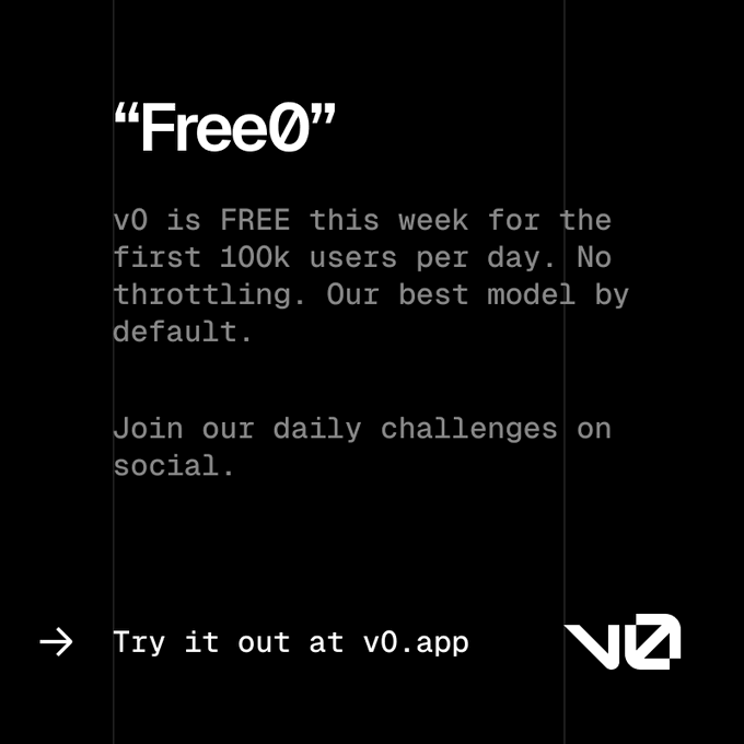 To celebrate the release of v0.app + agentic v0 we're launching "Free0" For the next 4 days, v0 is FREE! Each day we'll have challenges where you can earn more "Free0" by sharing your v0 creations. Challenge 1 threaded below👇